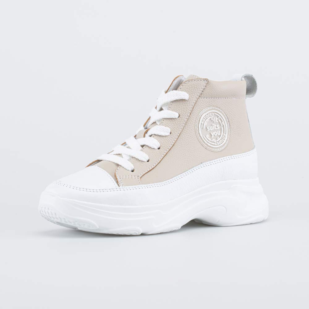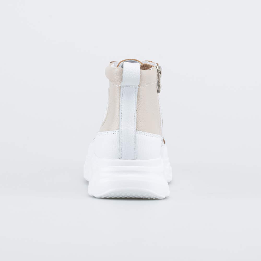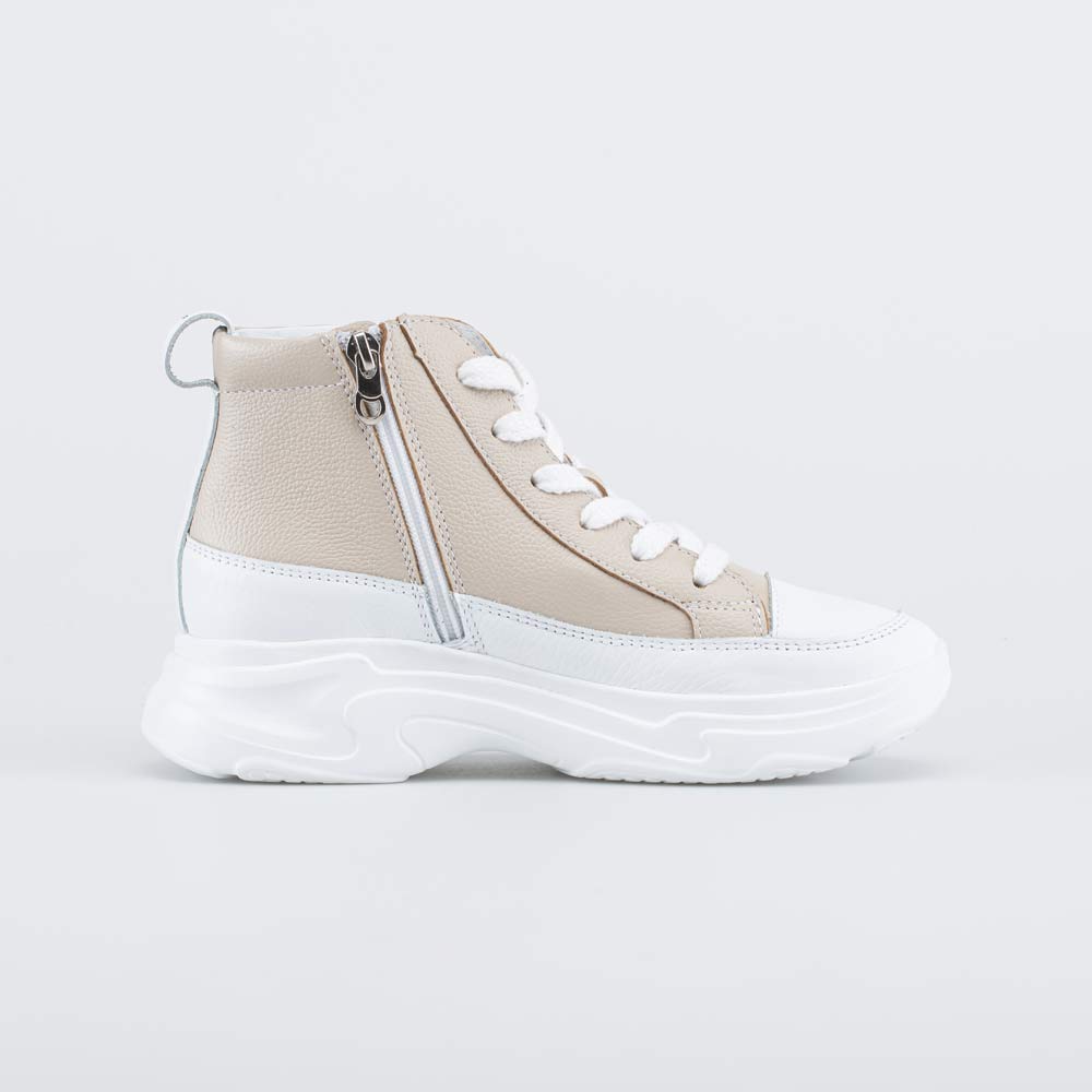 Ботинки на высокой подошве выполнены в бежево-белом цвете и предназначены для девочки школьного возраста.