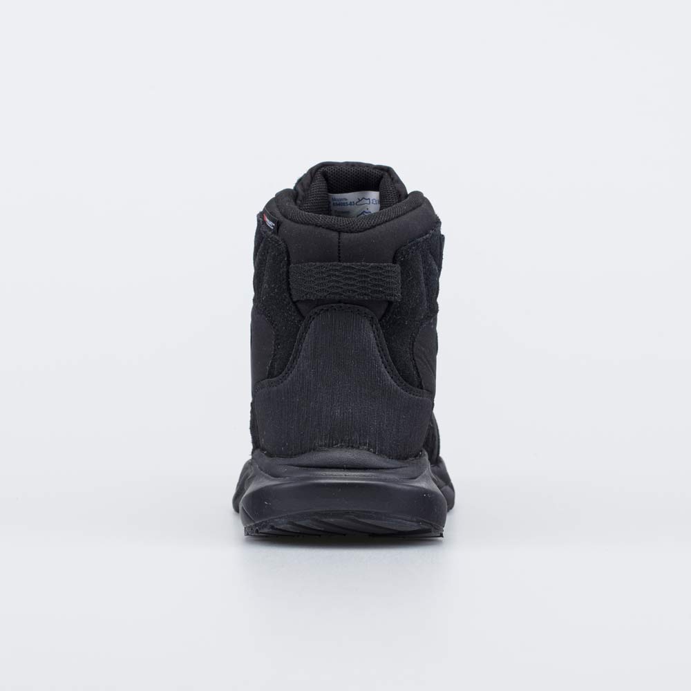 Верх черных ботинок изготовлен из многослойного материала софтшелл, который не продувается ветром. Ответственные детали выполнены из натуральной кожи. Носок и пятка защищены антивандальными накладками.