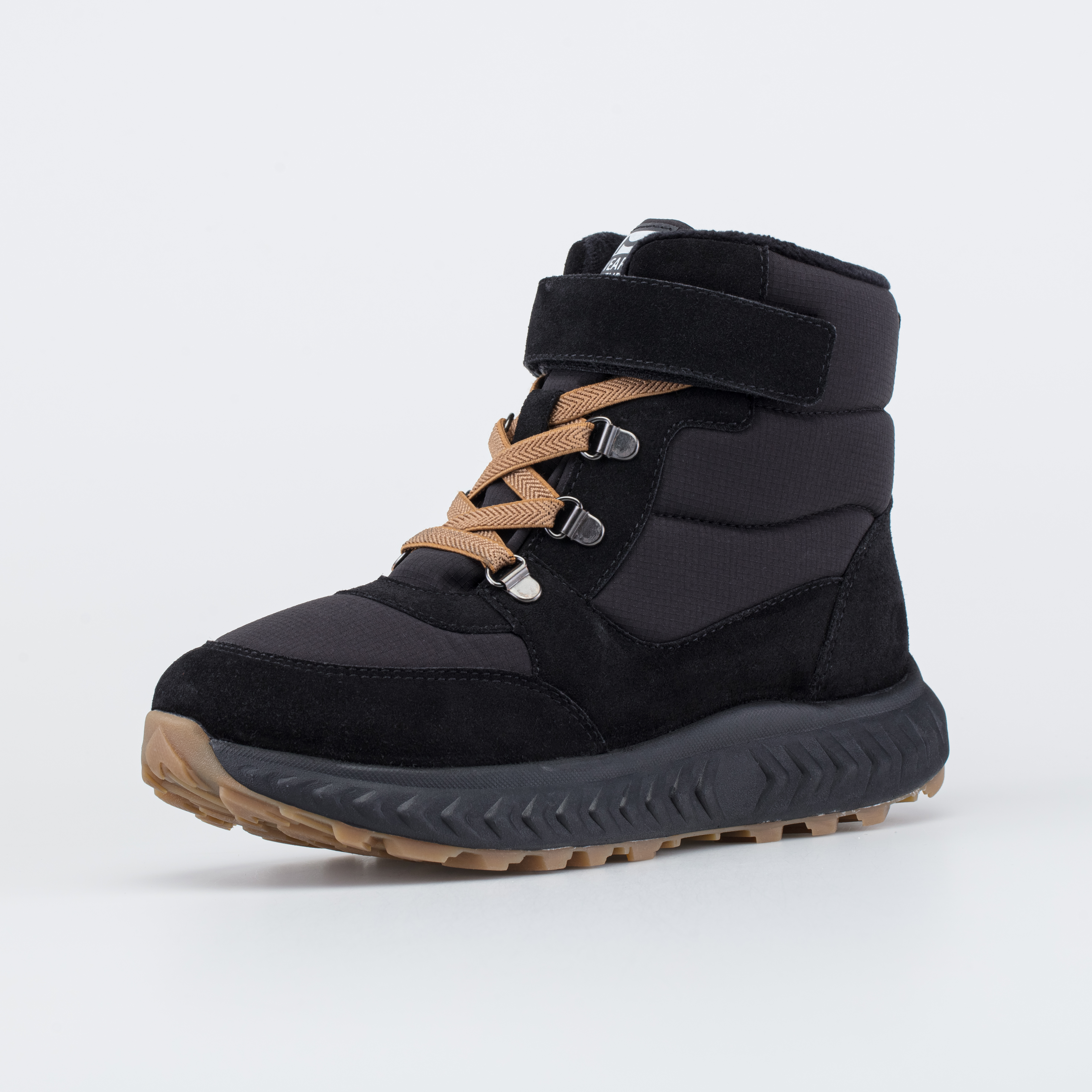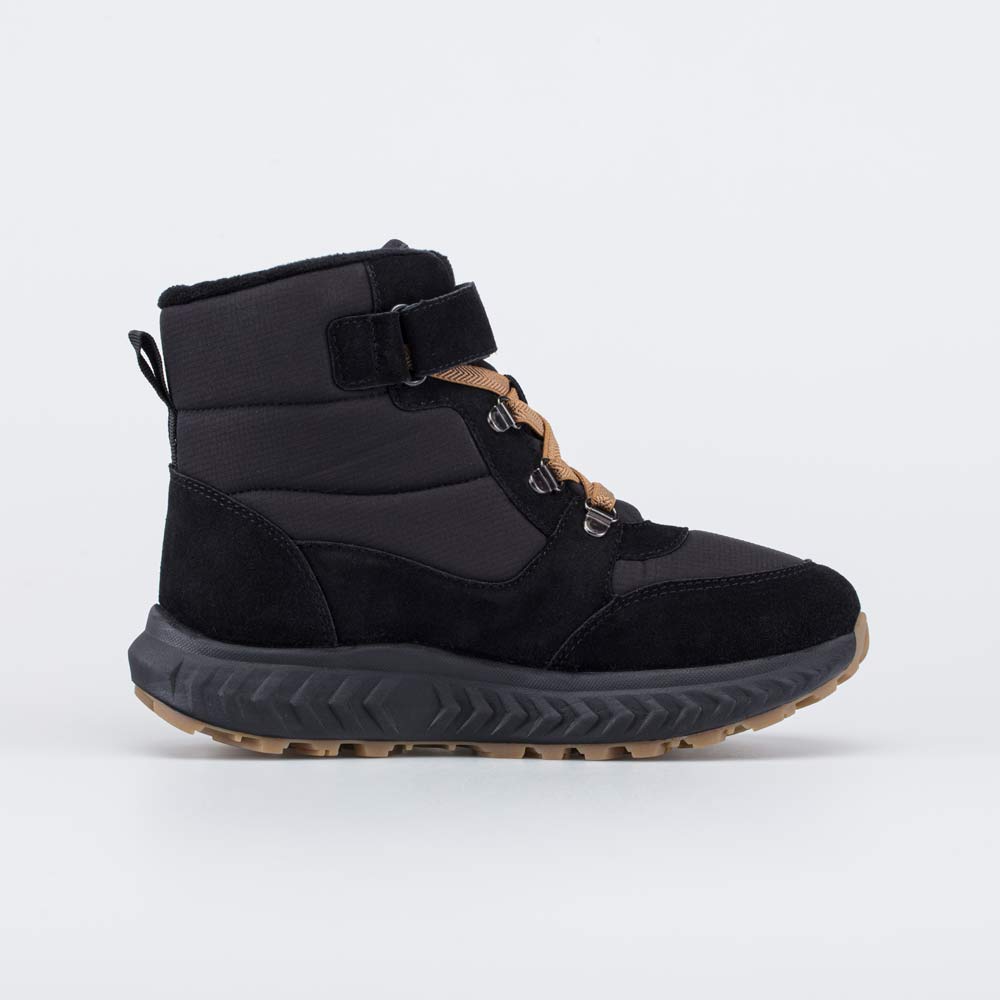 Зимние ботинки на липучках дополнены шнурками, которые не придется каждый раз завязывать.