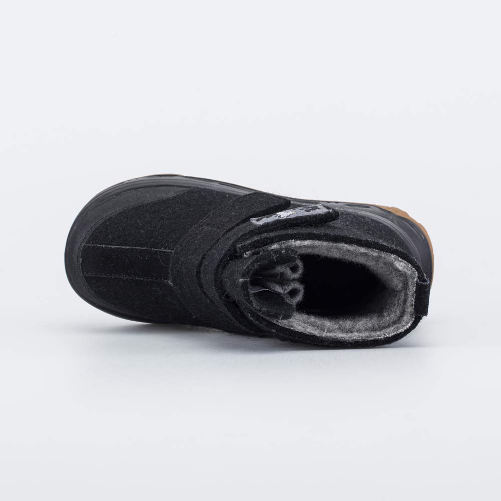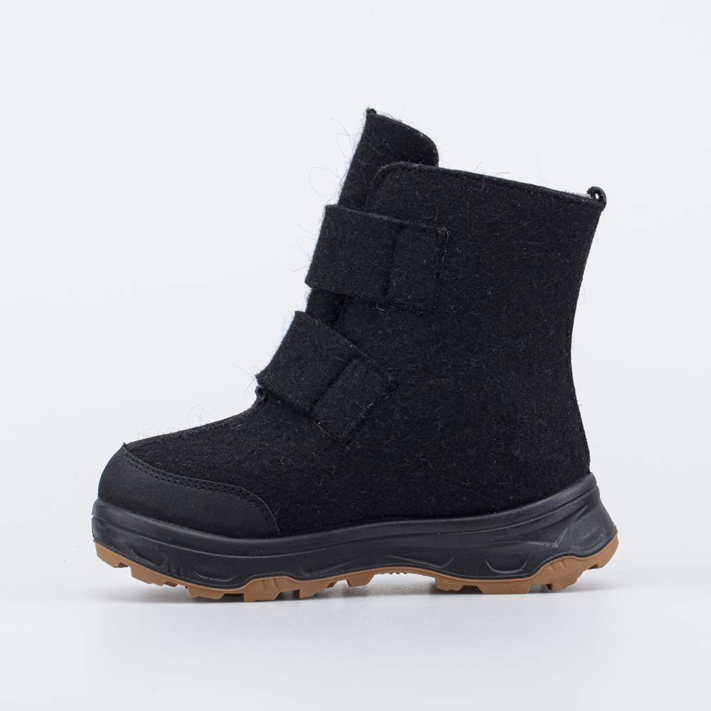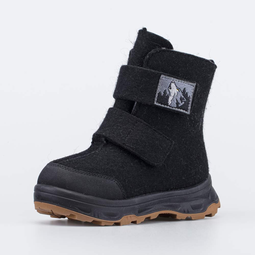 Черные валенки из натурального войлока, стилизованные под высокие ботинки и украшенные брутальной нашивкой в виде волка, разработаны для мальчика школьного возраста.