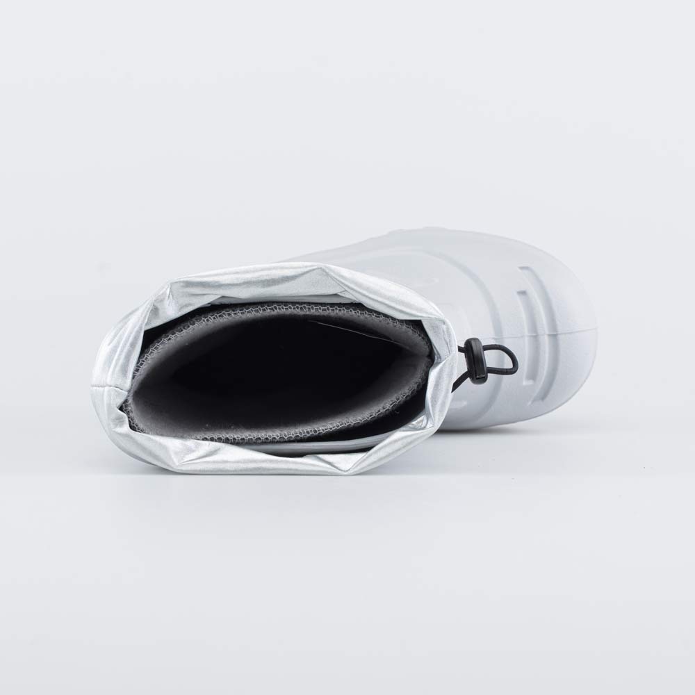 Верхний манжет из серебристого нейлона затягивается на шнурок с фиксатором и защищает от попадания воды внутрь обуви.