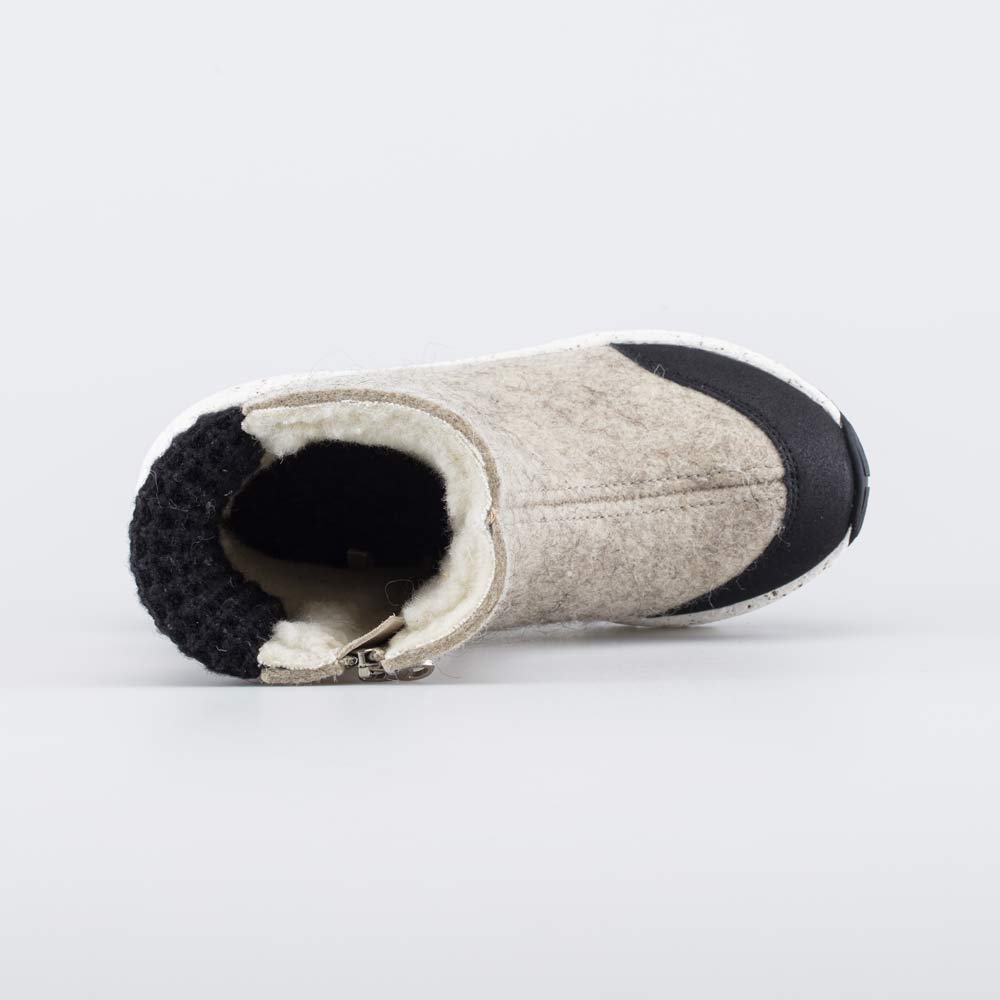 Бежевые валенки на подошве модной кроссовочной формы выглядят современно и подходят как для мальчика, так и для девочки. Дополнительную изюминку придает вязаный манжет.
