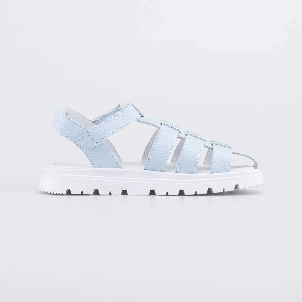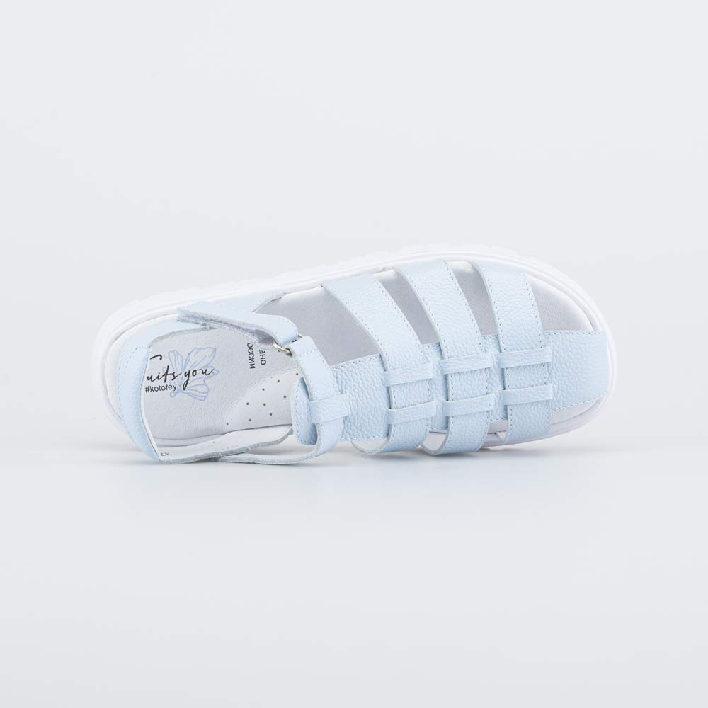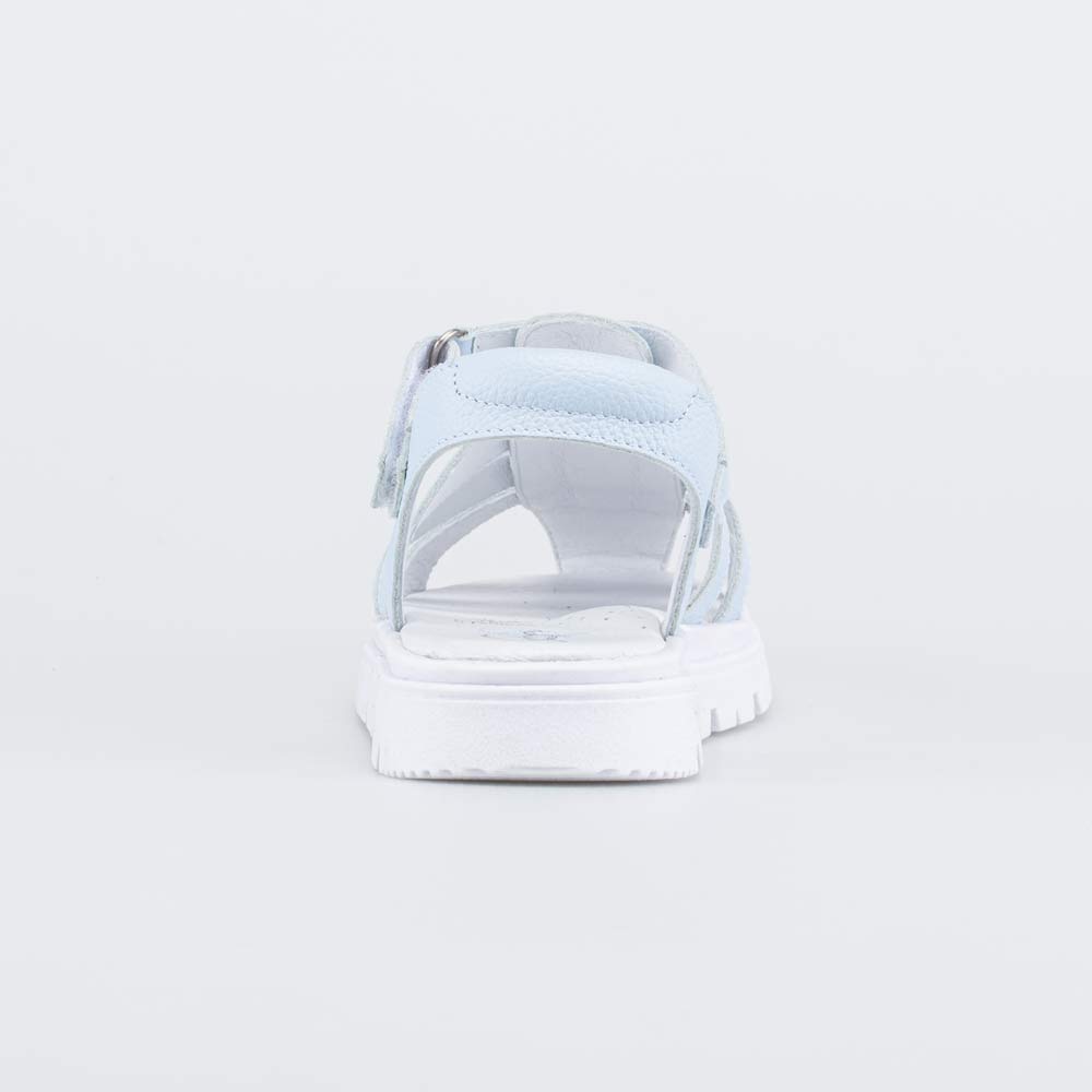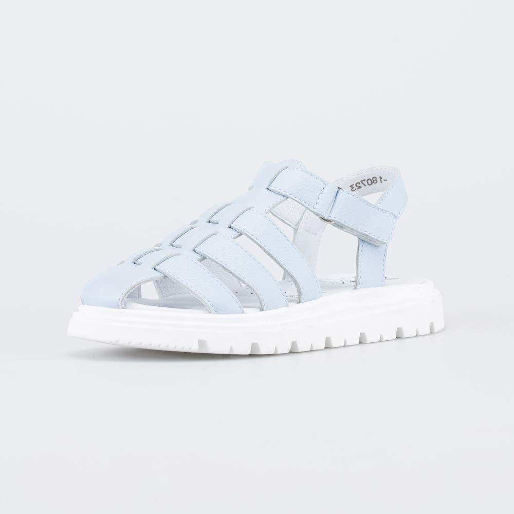 Голубые кожаные босоножки отлично подходят для летних образов девочки школьного возраста.