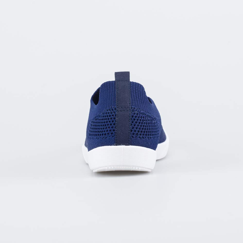 Синие кеды с белой подошвой имеют верх из вязаного текстиля, обладающего высокой воздухопроницаемостью. В такой дышащей обуви комфортно даже при длительной носке.
