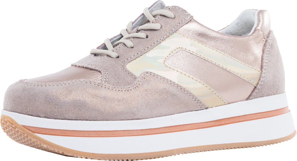 Стильные полуботинки выполнены полностью из натуральной кожи. Кожаная подкладка абсорбирует влагу и способствует поддержанию благоприятного микроклимата внутри обуви. Мягкий манжет создает комфорт при ходьбе и предотвращает натирание ножки. Утолщенная клиновидная подошва спортивного стиля выполнена из ТЭПа,гарантирует комфорт при носке. Модель фиксируется на ноге при помощи шнурков, что позволяет добиться идеальной посадки обуви. Актуальная металлизрованная расцветка на пике моды.