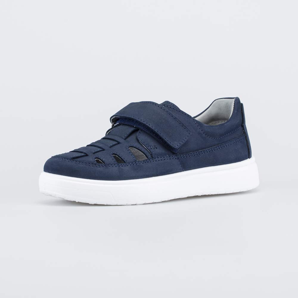 Верх изготовлен из гипоаллергенной и дышащей натуральной кожи-нубука синего цвета. Подкладка и стелька выполнены из белой натуральной кожи – не придется переживать, что школьная обувь окрасит носки.