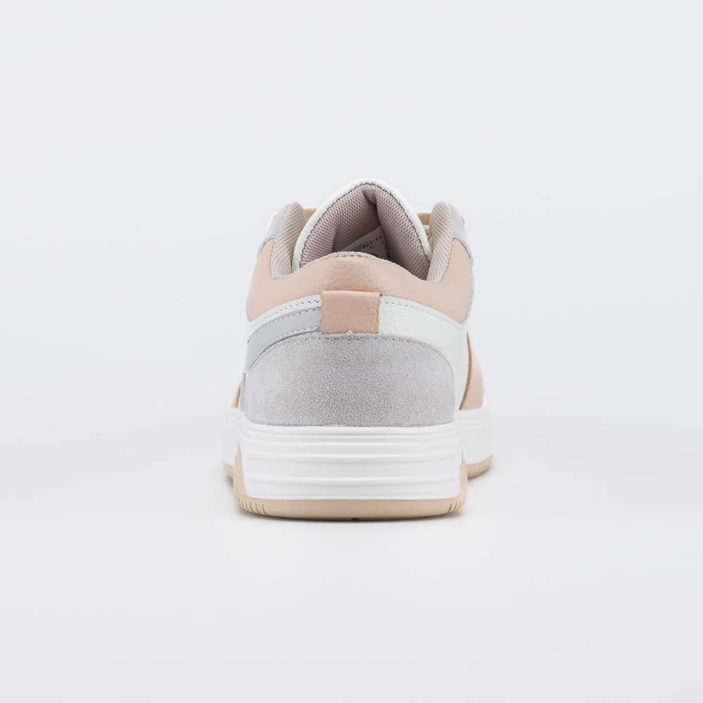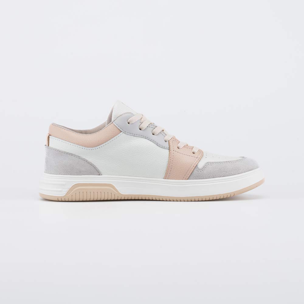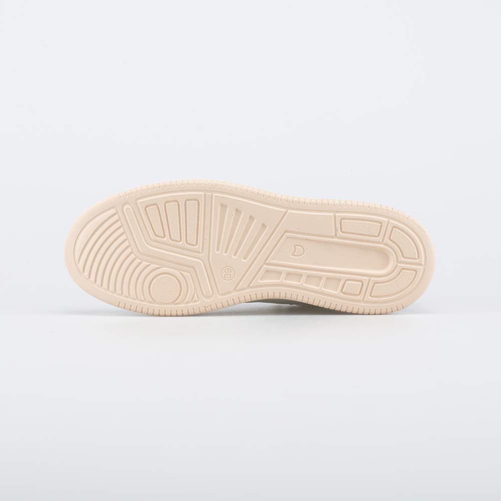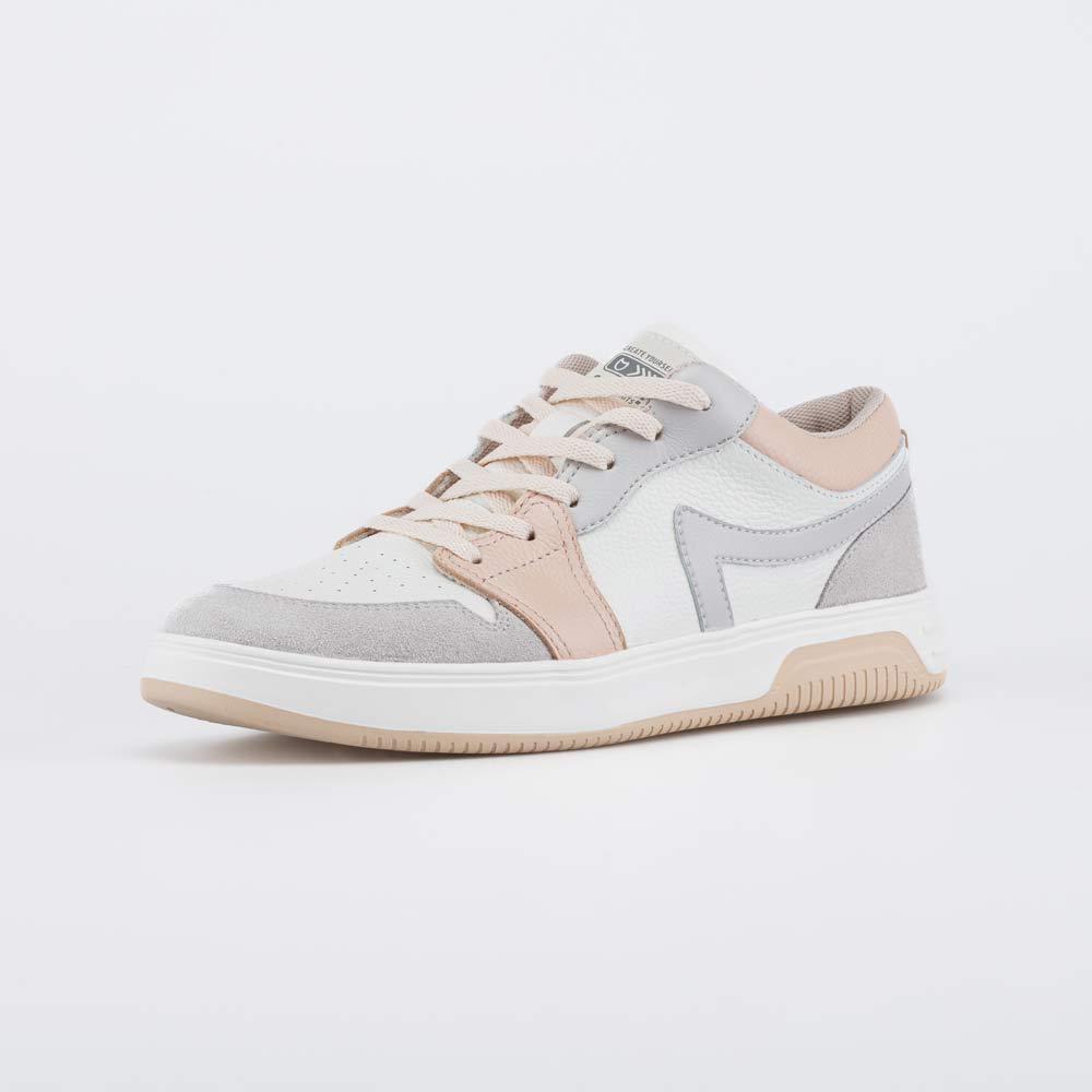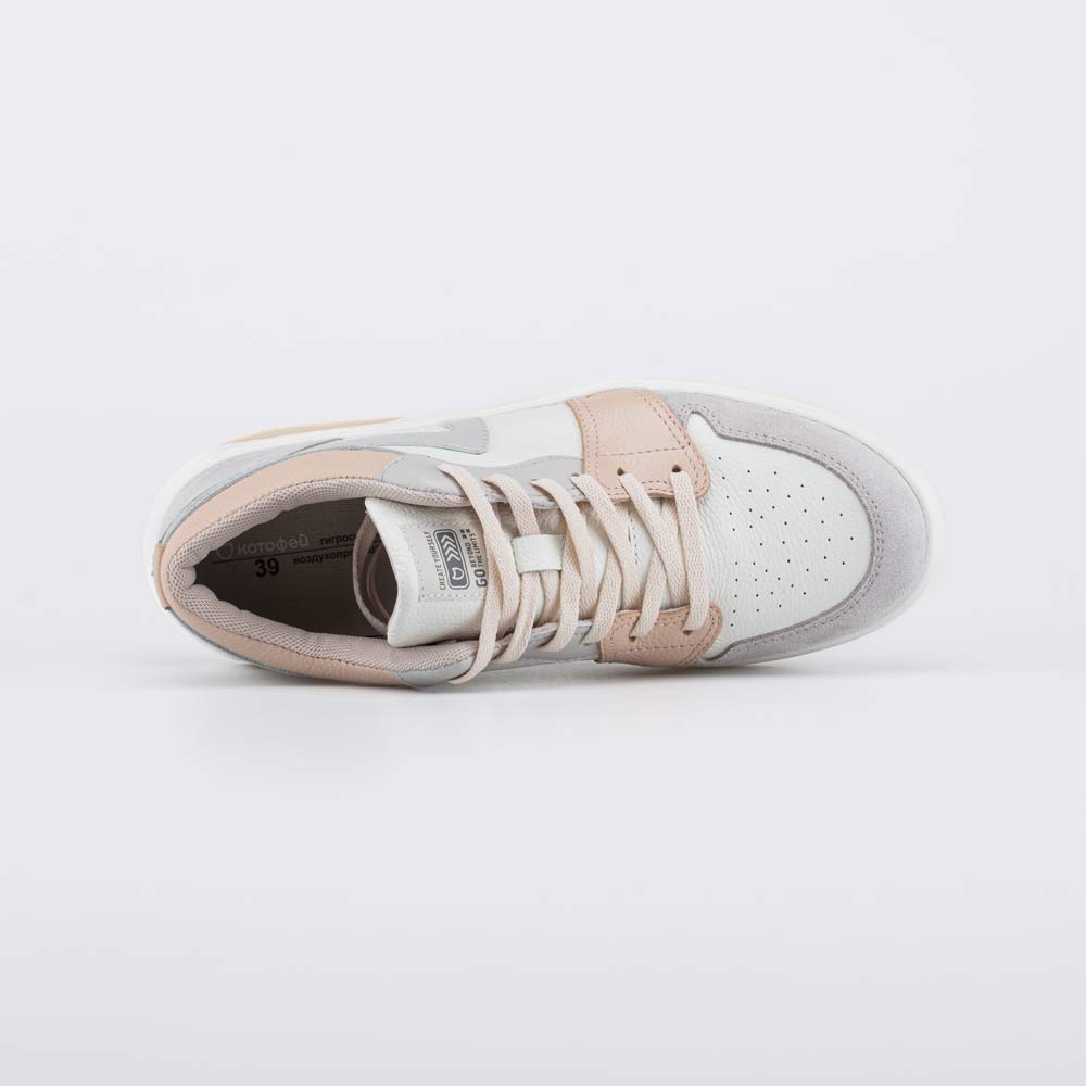 Полуботинки-кеды для девочки-подростка выполнены в сочетании трендовых цветов: серого и бежевого на белом фоне.