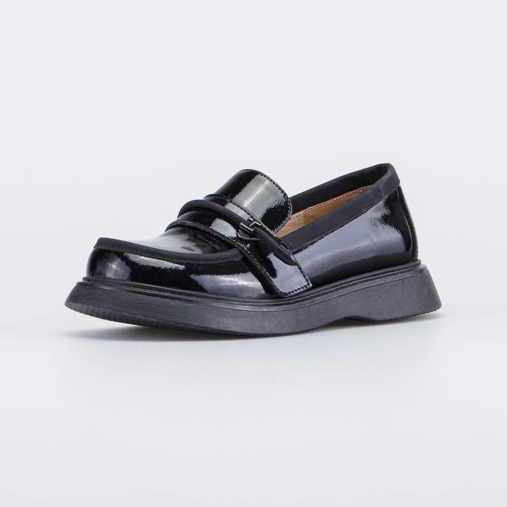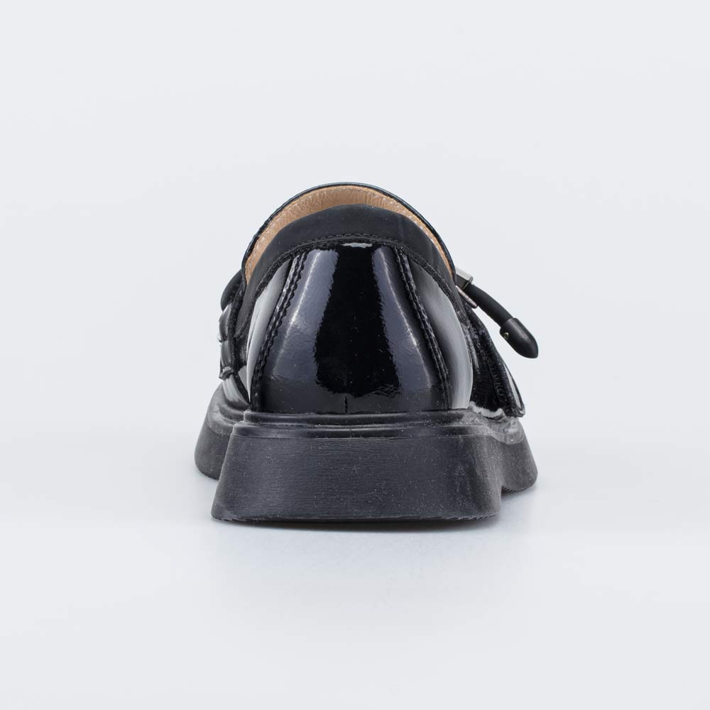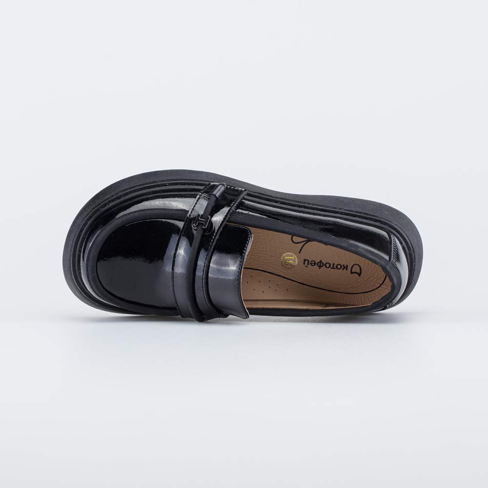 Верх изготовлен из гипоаллергенной и дышащей натуральной кожи с лаковым покрытием, которое делает черные туфли заметной деталью любого образа. Подкладка и стелька – из белой натуральной кожи. Не придется переживать, что школьная обувь окрасит носочки или колготки.