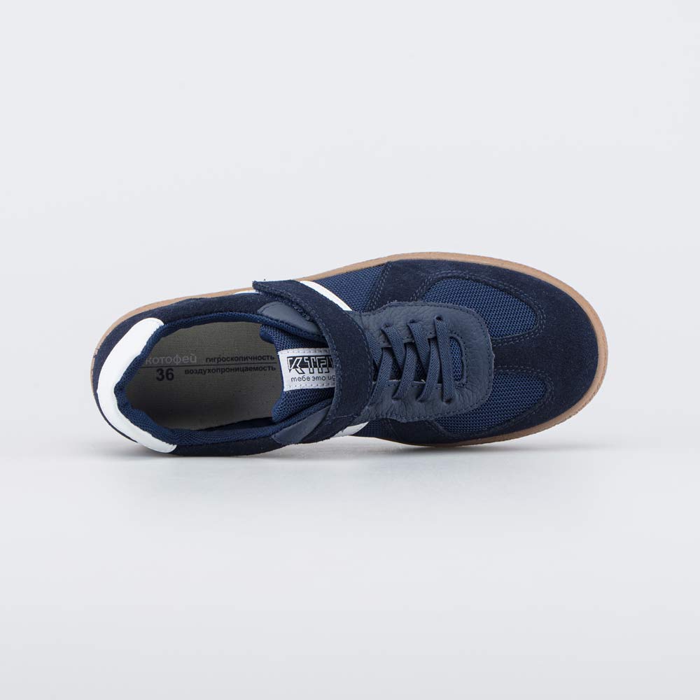 Синие кеды имеют верх из комбинации натурального велюра и плотного сетчатого материала, который обеспечивает хорошую воздухопроницаемость и комфорт даже при длительной носке.