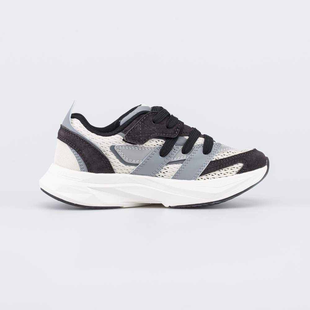 Верх серо-бежевых кроссовок изготовлен из комбинации натуральной и искусственной кожи, а также вязаного текстиля, который образует сквозные отверстия для оптимальной вентиляции.