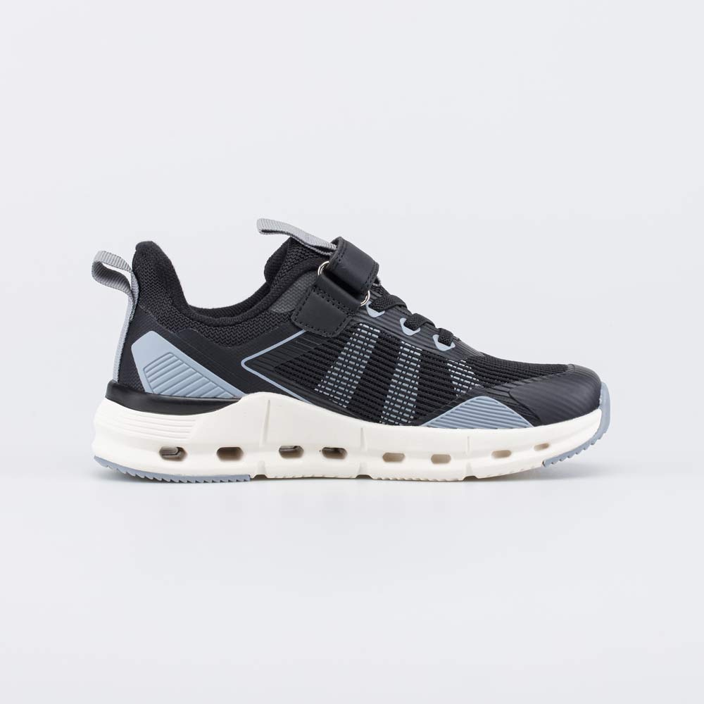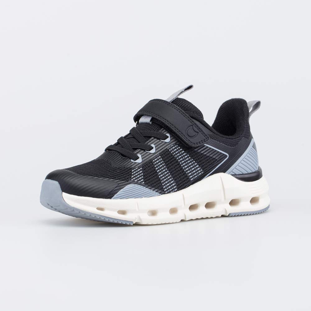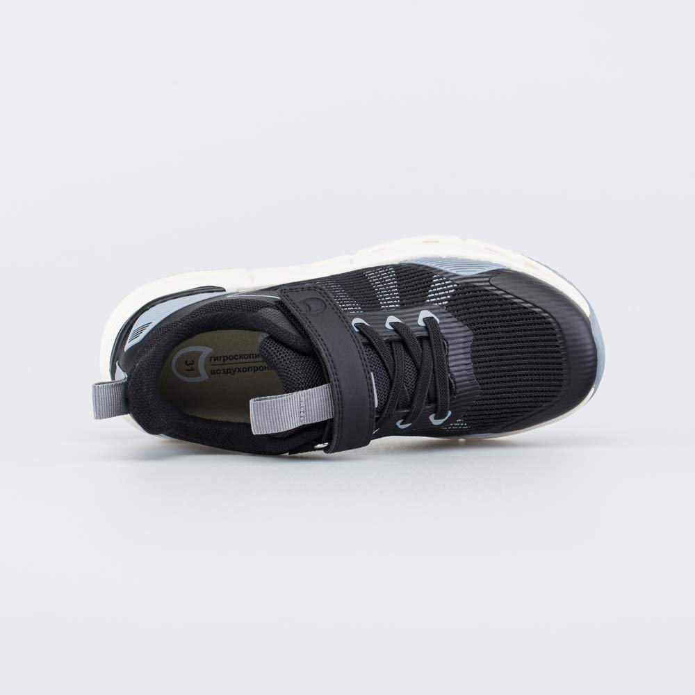 Верх этих черных кроссовок изготовлен из текстиля. Его вязаная структура обеспечивает высокую воздухопроницаемость подростковой обуви. При этом подкладка из гипоаллергенного полиамида делает кроссовки достаточно плотными, чтобы носить их в сухой осенне-весенний сезон. Формованная основа съемной текстильной стельки мягко амортизирует и поддерживает стопу.