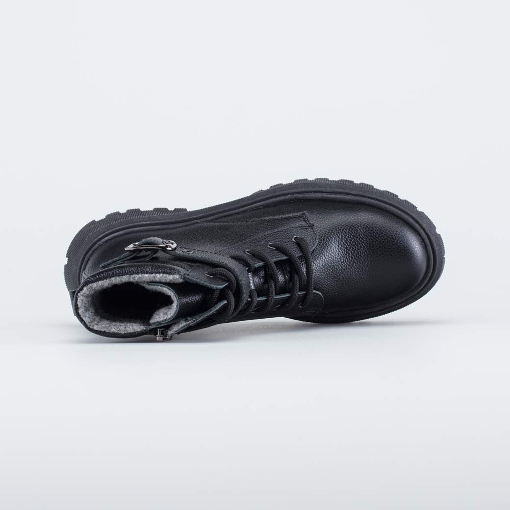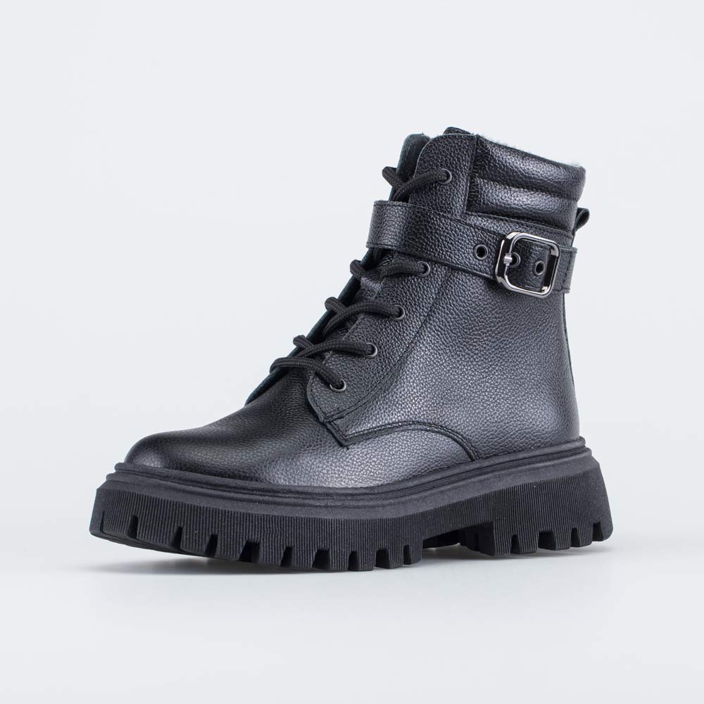 Верх демисезонных ботинок выполнен из дышащей натуральной кожи черного цвета, что делает модель универсальным дополнением любого образа.