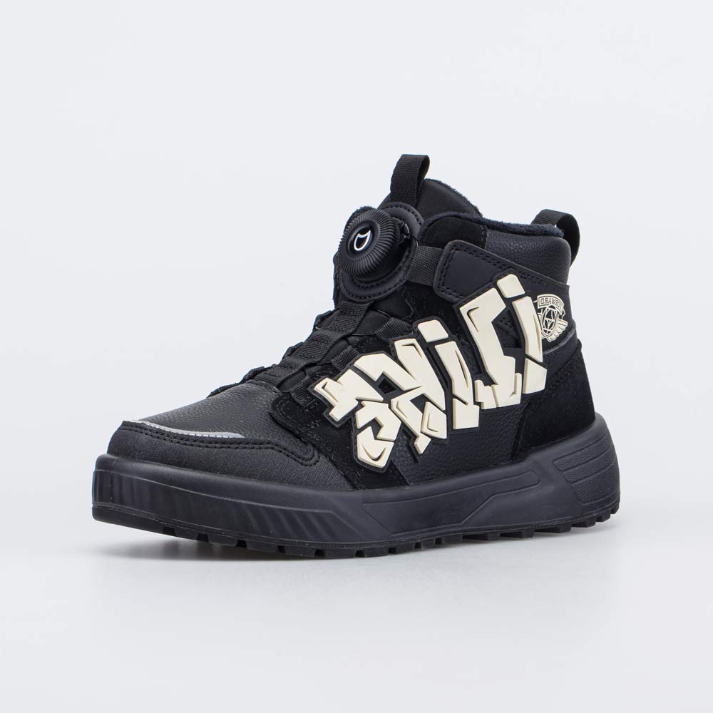 Зимние ботинки, декорированные объемной пластизольной нашивкой в урбанистическом стиле, походят для мальчика.
