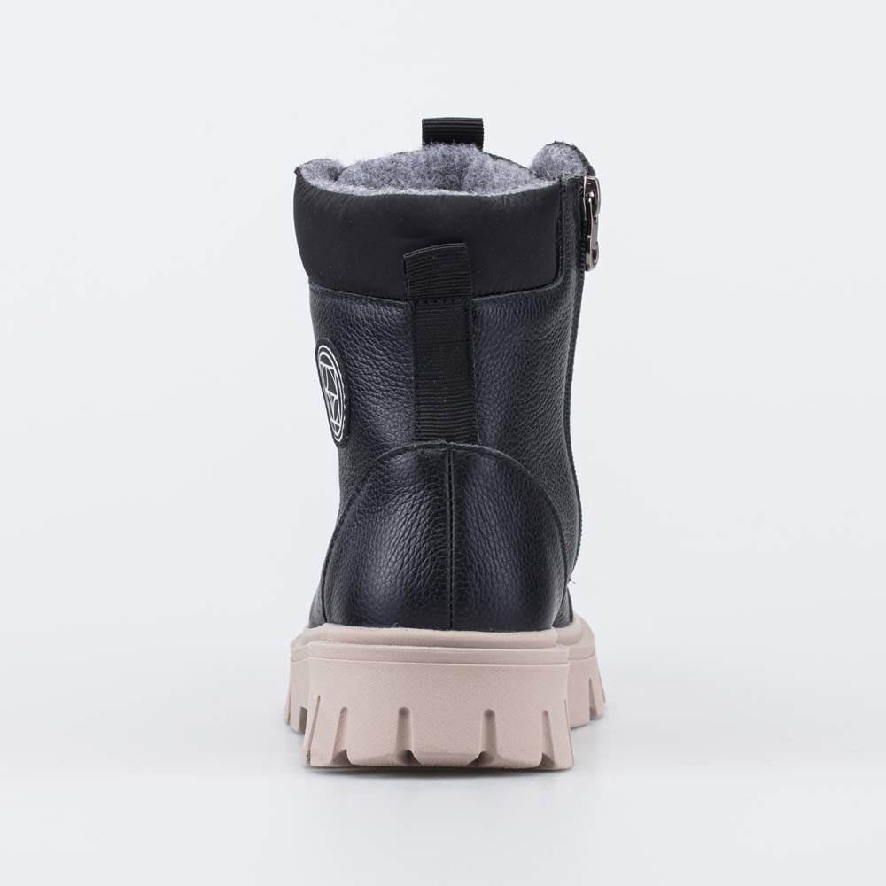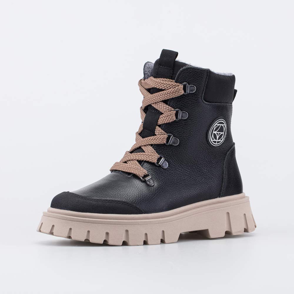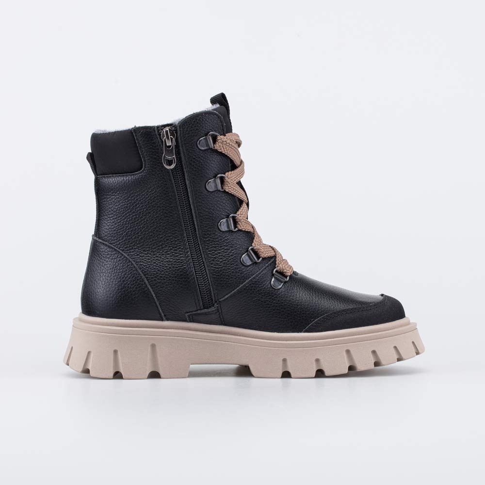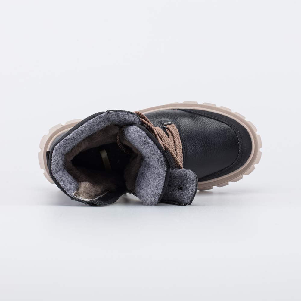 Верх этих черных ботинок изготовлен из натуральной кожи бежевого цвета. Носочная часть усилена дополнительной кожаной накладкой с ПУ-покрытием, предохраняющей зимнюю обувь от повреждений и реагентов.