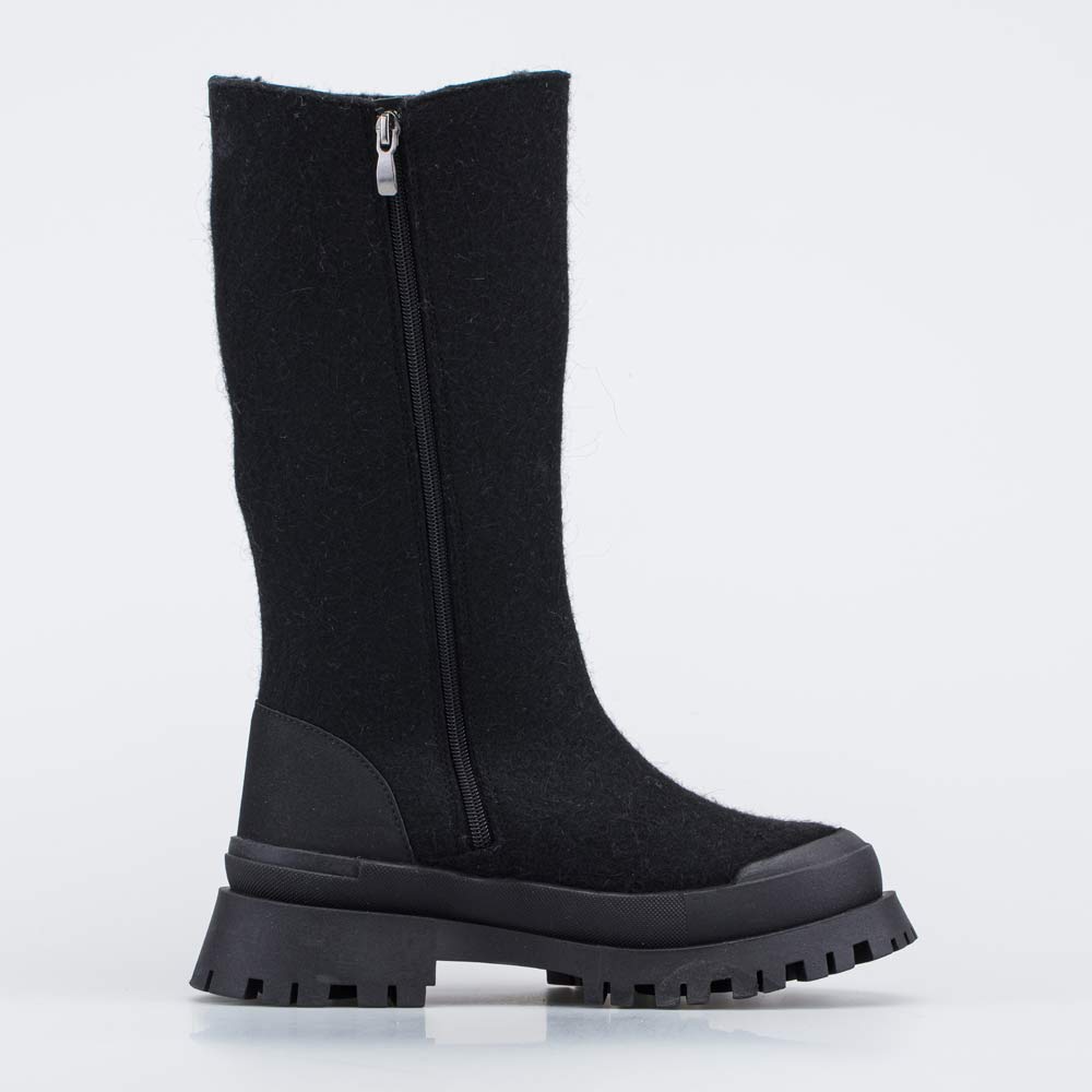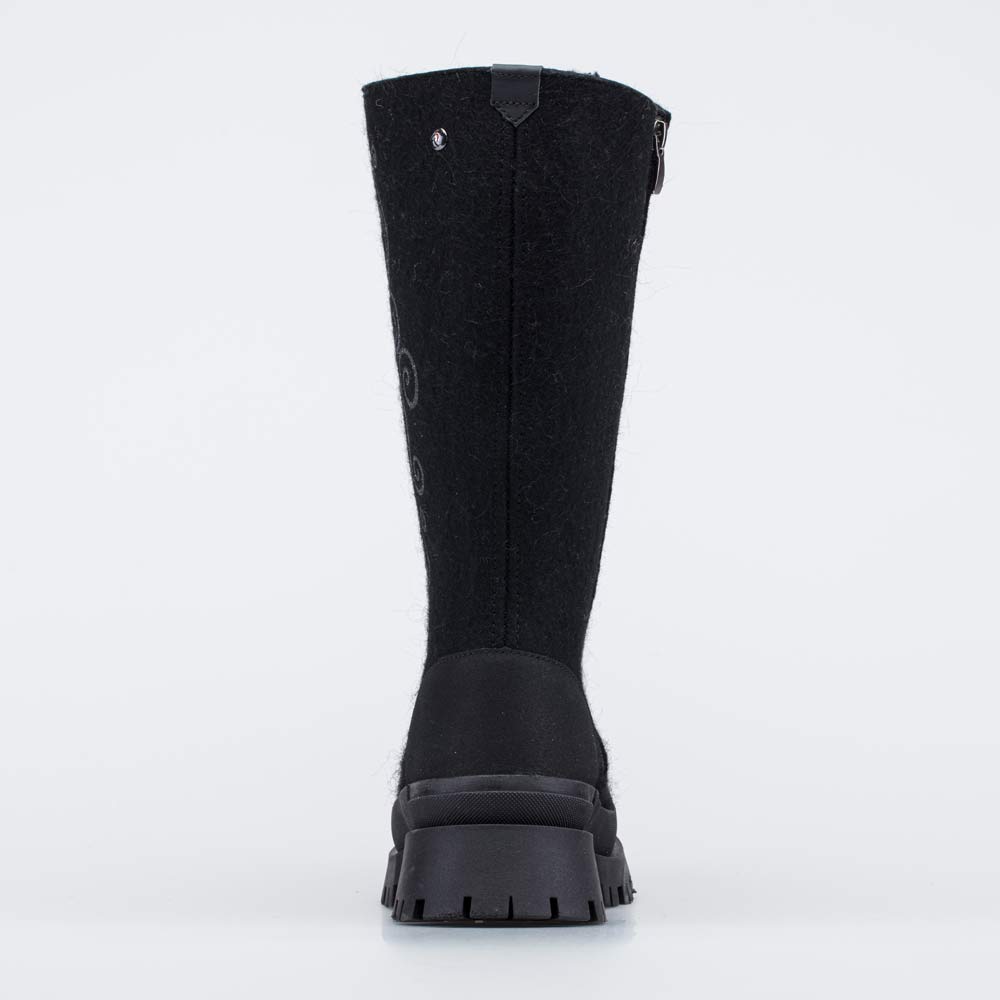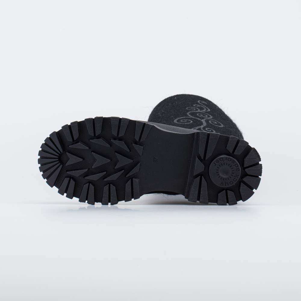 Подошва из ТЭП (термоэластопласта) с высоким протектором обладает повышенной устойчивостью на зимних дорожках. По всему периметру образует глубокий наплыв на войлок, предохраняя его от влаги и реагентов. Пяточная часть дополнительно защищена кожаной накладкой.