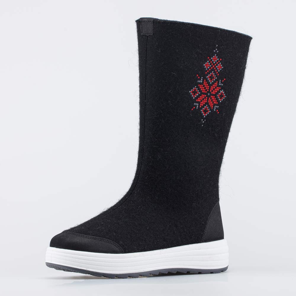 Высокие черные валенки серии Арктик имеют увеличенную толщину стельки и выделяются среди других наивысшими теплозащитными качествами. Вышивка на голенище придает им неповторимый колорит национальной зимней обуви.