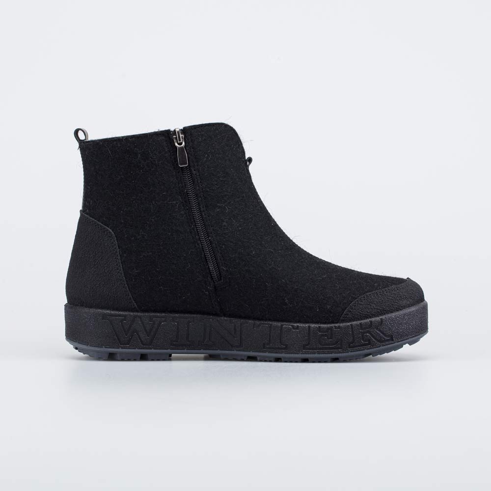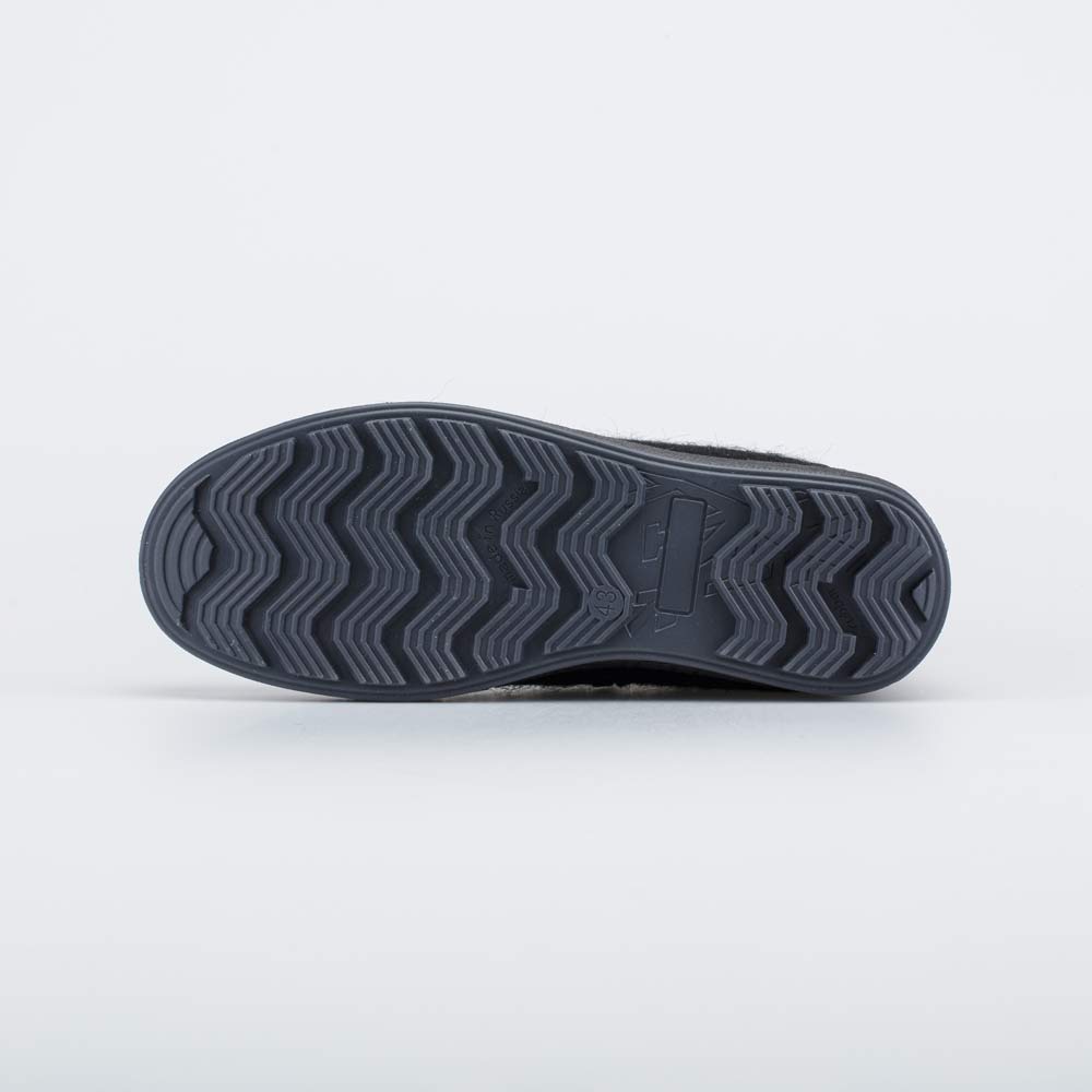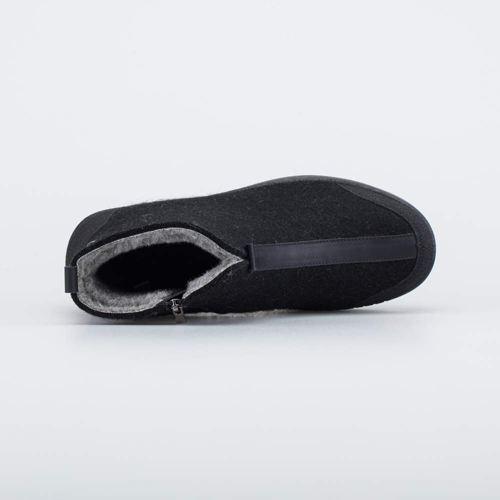Войлок плотный, с водоотталкивающими свойствами. Он надежно сохраняет тепло, дышит и создаёт приятный микроклимат вокруг стопы. Носок и пятка защищены кожаными накладками с ПУ-покрытием. Классический черный цвет делает модель подходящей для разных случаев и стилей.