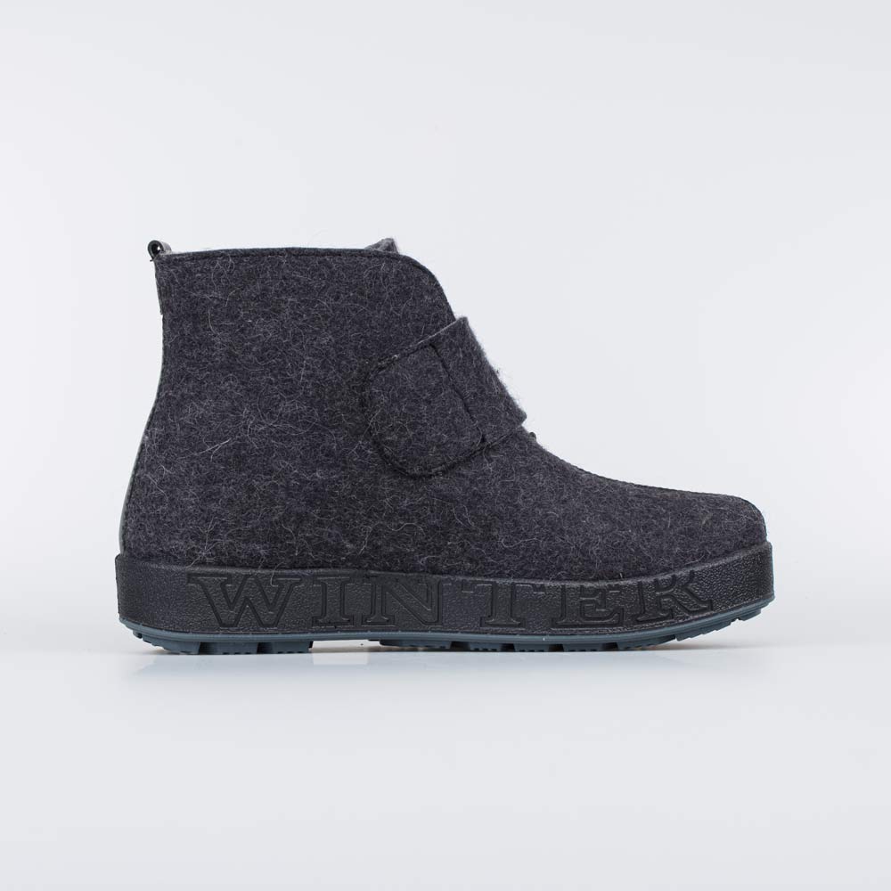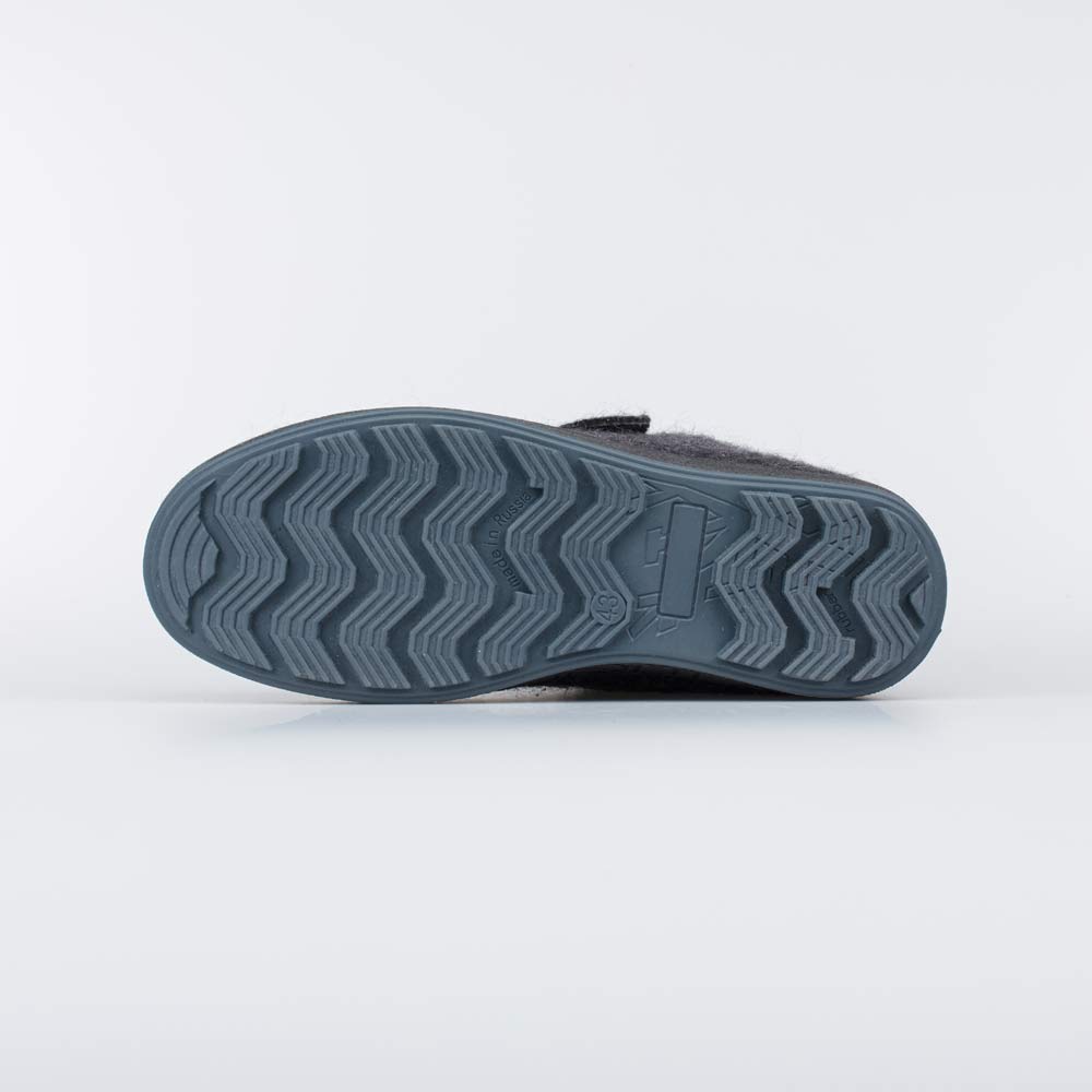 Укороченные мужские валенки серого цвета на подошве выполнены из натурального войлока.